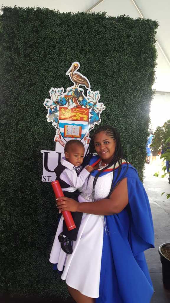Shenece was excelling at the UWI and nearing the completion of her degree she became pregnant with her son. For some this may be a challenge but she saw it as an opportunity which was not going to prevent her from achieving her goals. Driven by her desire for success, Shenece went to school pregnant and after giving birth to her son, she spent 6 weeks away from school and then returned, giving presentations with her son in her arms and attending classes with him right by her side. He gave her the strength and motivation to keep pushing and in 2019 Shenece graduated with Upper Second Class Honours with her BSc in Geography and Tropical Landscaping.